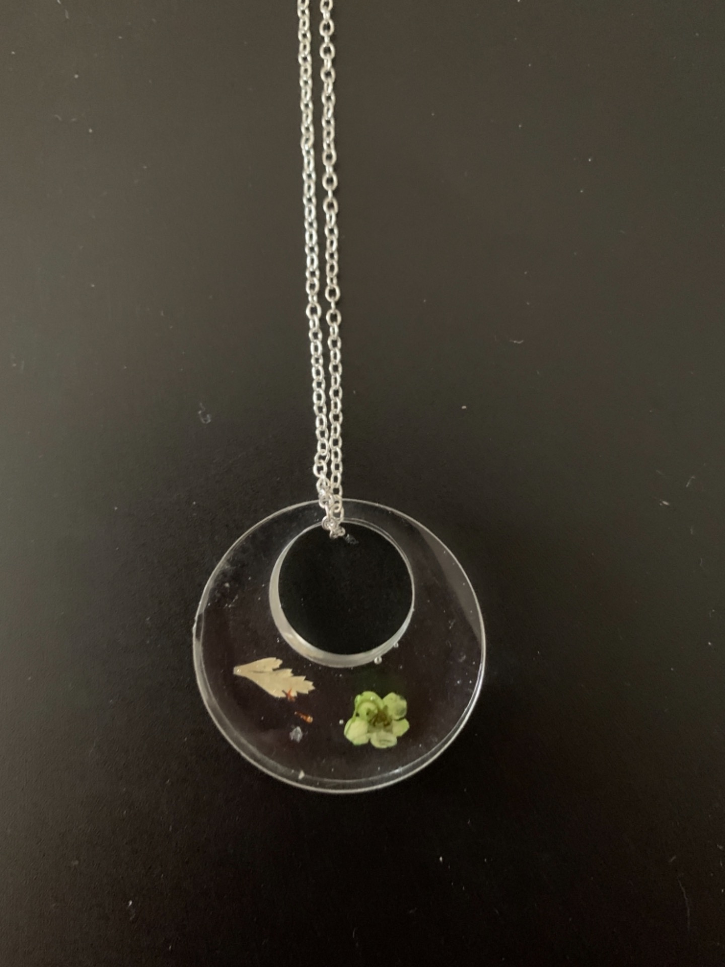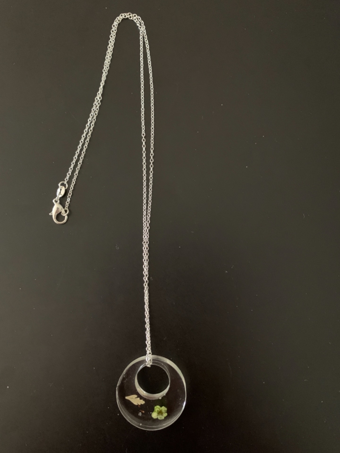 Collier avec une chaîne (acier) et un pendentif rond troué avec de véritables fleurs à l’intérieur.Chaîne disponible en 45cm, 50cm, 55cm (photo) ainsi que 60cm.