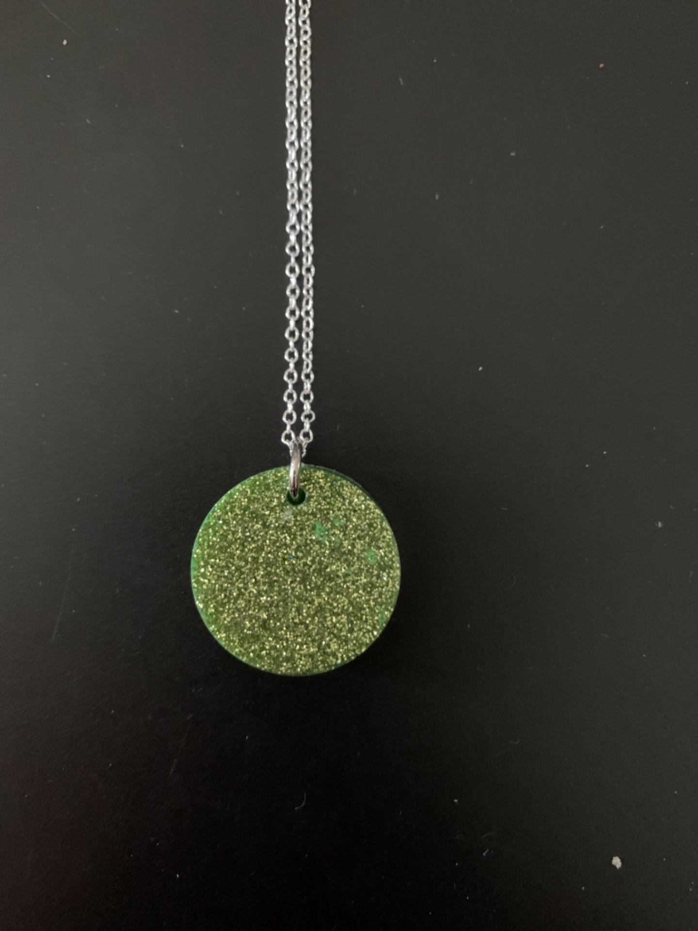 Collier avec une chaîne (acier) et un pendentif rond vert avec des paillettes jaunes.Chaîne de différentes tailles 45cm, 50cm, 55cm (photo) ainsi que 60cm.