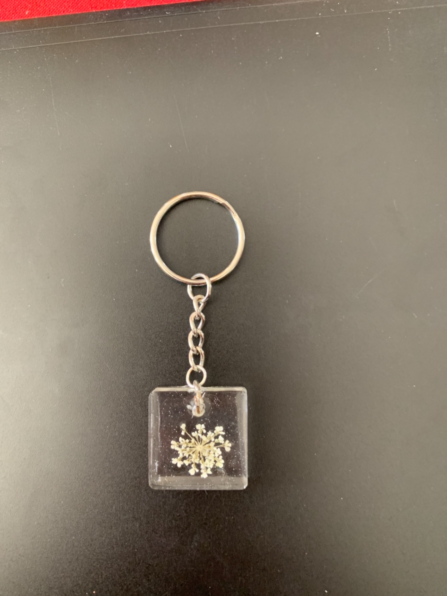 Porte clé carré avec une véritable fleur à l’intérieur.
