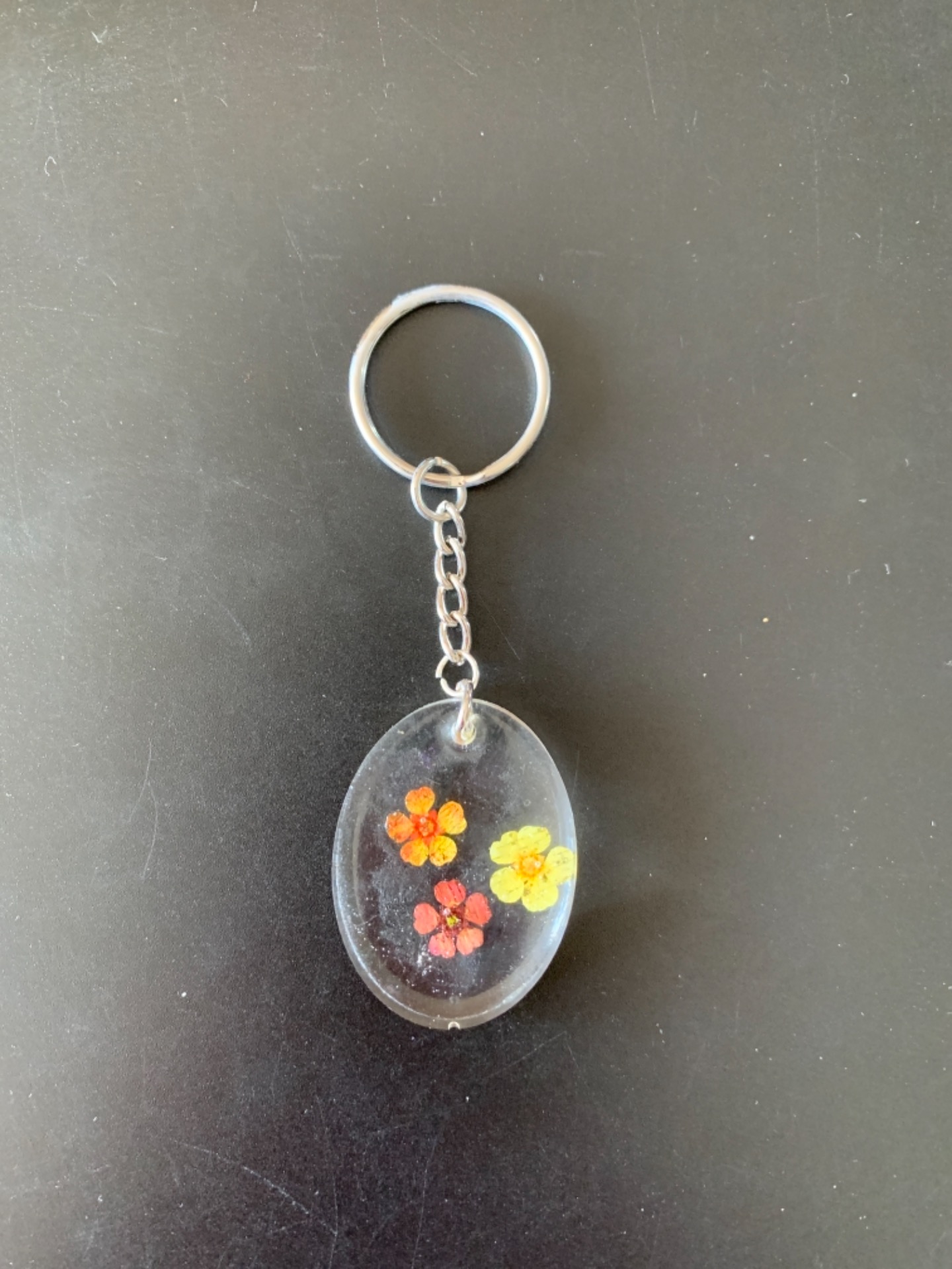Porte clé oval avec de véritables fleurs à l’intérieur.